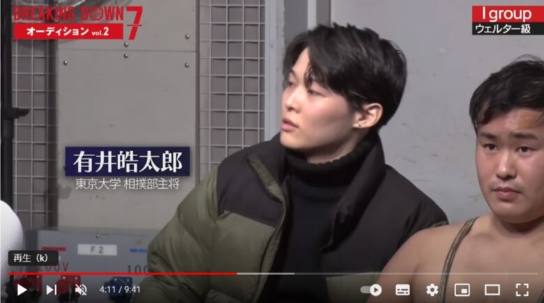 東大相撲部の主将を務める有井皓太郎(ありいこうたろう)さんは、ブレイキングダウン7のオーディションに参加。