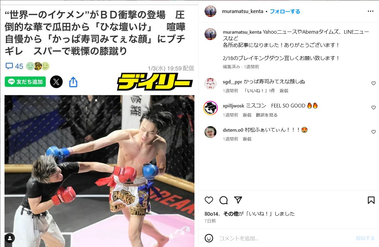 そんなむらけん(村松健太)さんは2024年2月18日に開催されるブレイキングダウン11に出場します。